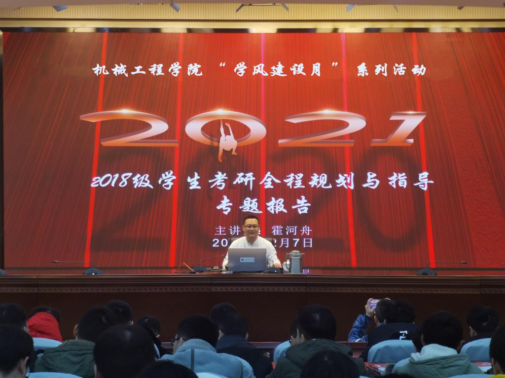 为了让大学生了解最新的考研动态,明确考研意向,进行科学规划,机械工程学院于12月7日下午在校学术会议中心黄海厅举办考研全程规划与指导专题报告会。本场报告会由教育部大学生在线考研顾问、全国大学生职业规划专家霍河舟老师主讲。学院全体18级本科生聆听了报告。