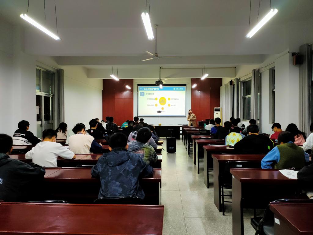 蒋莹莹老师先是进行了一个趣味测试,让每位同学对自己的压力做一个评分,以此来引入讲座的主题,然后通过压力的概念与分类、压力的影响与功能、压力管理与挫折应对三个方面带领大家重新认识压力。讲座过程中,蒋莹莹老师介绍了许多生动形象的案例,激起同学们共鸣,告诉我们面对挫折应该理智冷静,不要被挫折打败。在讲到用生理策略调节压力时,蒋老师分享了一种蝴蝶拍的调节方式,大家兴致高涨,纷纷跟蒋老师一起做起了蝴蝶拍。