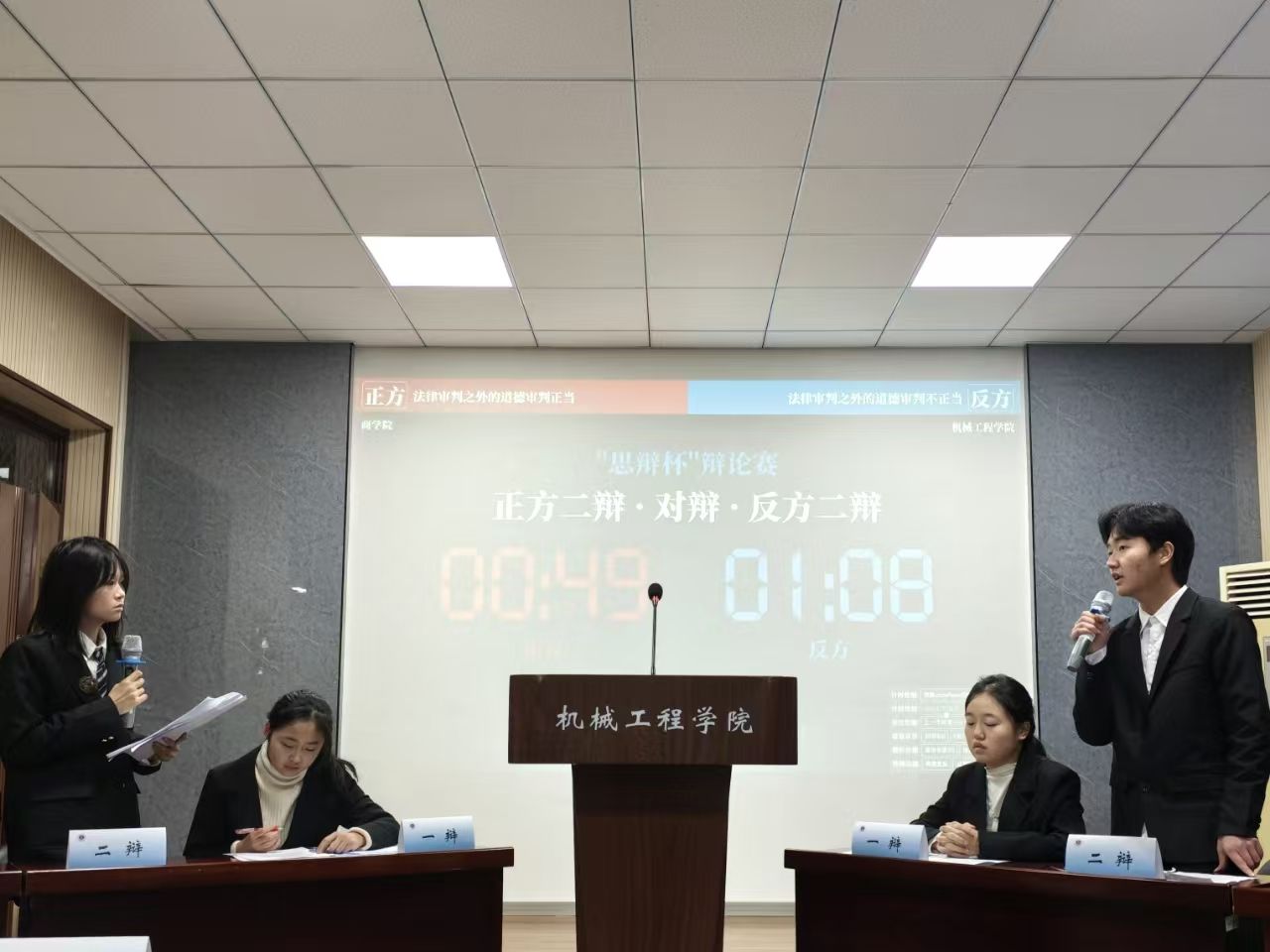 为了迎接第十一个国家宪法日,弘扬宪法精神,维护宪法权威,12月3日晚上,机械工程学院在机械楼N210会议室举办“思辩杯”法治辩论赛,本次辩论赛的辩题为“法律审判之外的道德审判是否正当”。机械工程学院辩论队和商学院辩论队作为正反双方,展开了激烈的角逐。