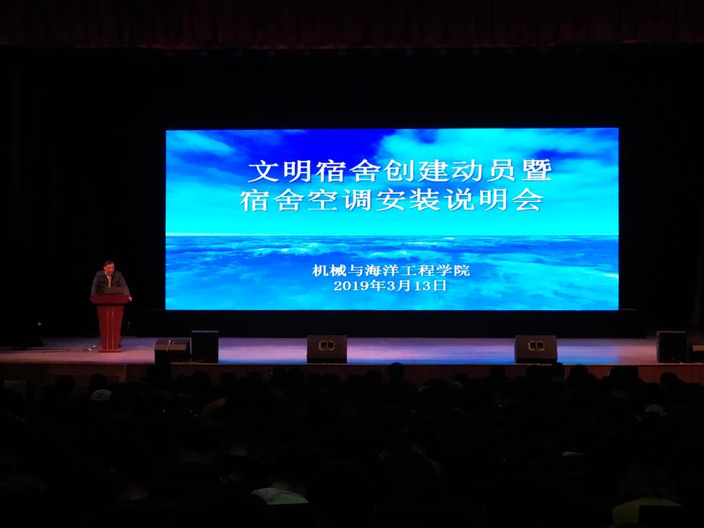 3月13日晚,机械学院在大礼堂召开文明宿舍创建动员暨学生公寓空调安装情况说明会。校学工处副处长张志浩,院党委书记毛纪登、全体辅导员和全院学生参加会议。院党委副书记赵求勇主持会议。