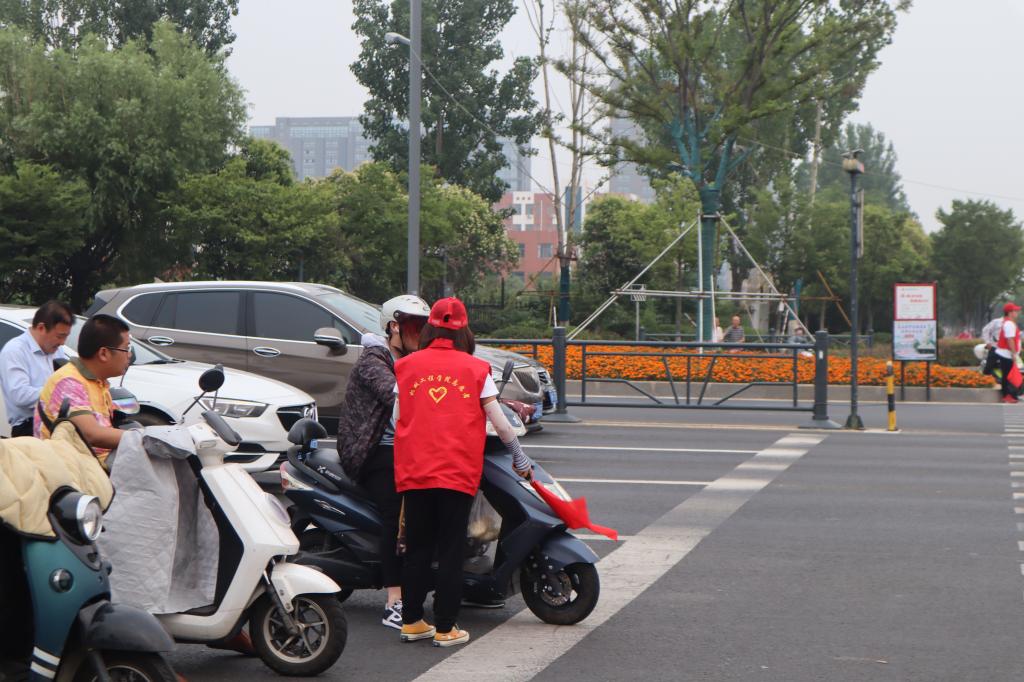 “您好,您的车子压到斑马线了,存在安全隐患,请您往后退。”刚到路口,就遇到参与执勤的志愿者李明哲同学正在耐心劝导一位骑车等绿灯的市民。经过解释与劝说,该市民退回到斑马线后,并对执勤的志愿者竖起了大拇指。同学们笔直的身姿、坚定的眼神、耐心的劝导打消了老师们的疑虑。“同学们辛苦了,交警同志们辛苦了!”赵求勇给交警同志、志愿者同学们送来了水果。赵求勇带来了学院党政领导的关心与慰问,提醒大家注意人身安全,鼓励广大青年学生担负新使命、实现新作为,在社会实践中历练自我、提升自我。