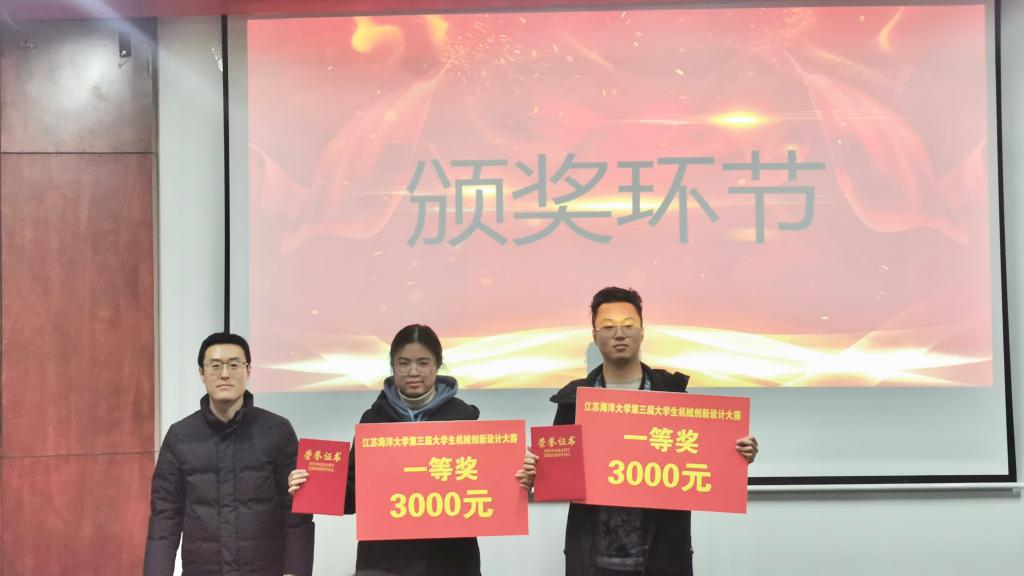 本次决赛,荣获一等奖的是胡苏文团队的“语音智能垃圾桶”和王泽团队的“自滑落式智能垃圾桶”。获得二等奖的作品是“公交车行李箱固定机构”、“智能模块化踢脚线”、“海洋垃圾回收船”和“垃圾分类箱”。获得三等奖的是“海洋垃圾回收机械装置”、“风力发电马路隔离栏”、“小便池感应门”和“辅助老人上下楼装置”。评委老师为获奖选手颁发了荣誉证书和奖金。