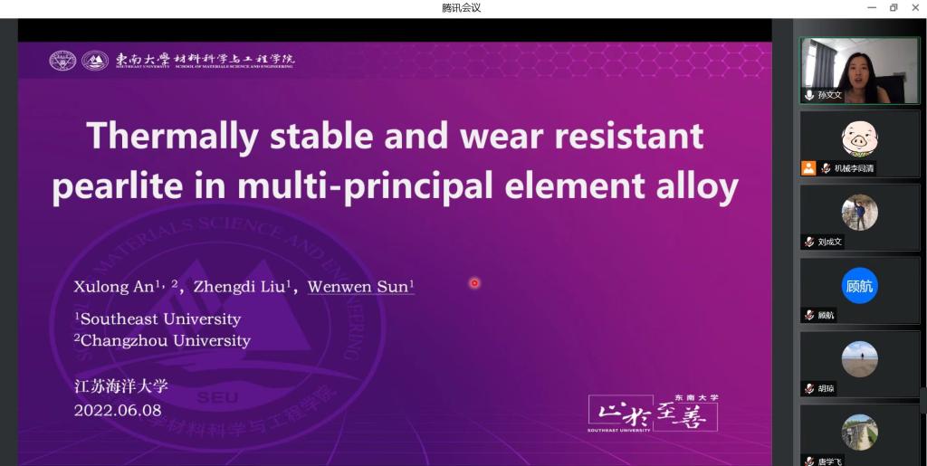 6月8日下午,东南大学孙文文教授应邀在腾讯会议平台为我院师生作题为“耐高温磨损的新型强韧珠光体多主元合金”的学术报告。报告会由副院长贺毅强主持,全院教师和部分学生参加了报告会。