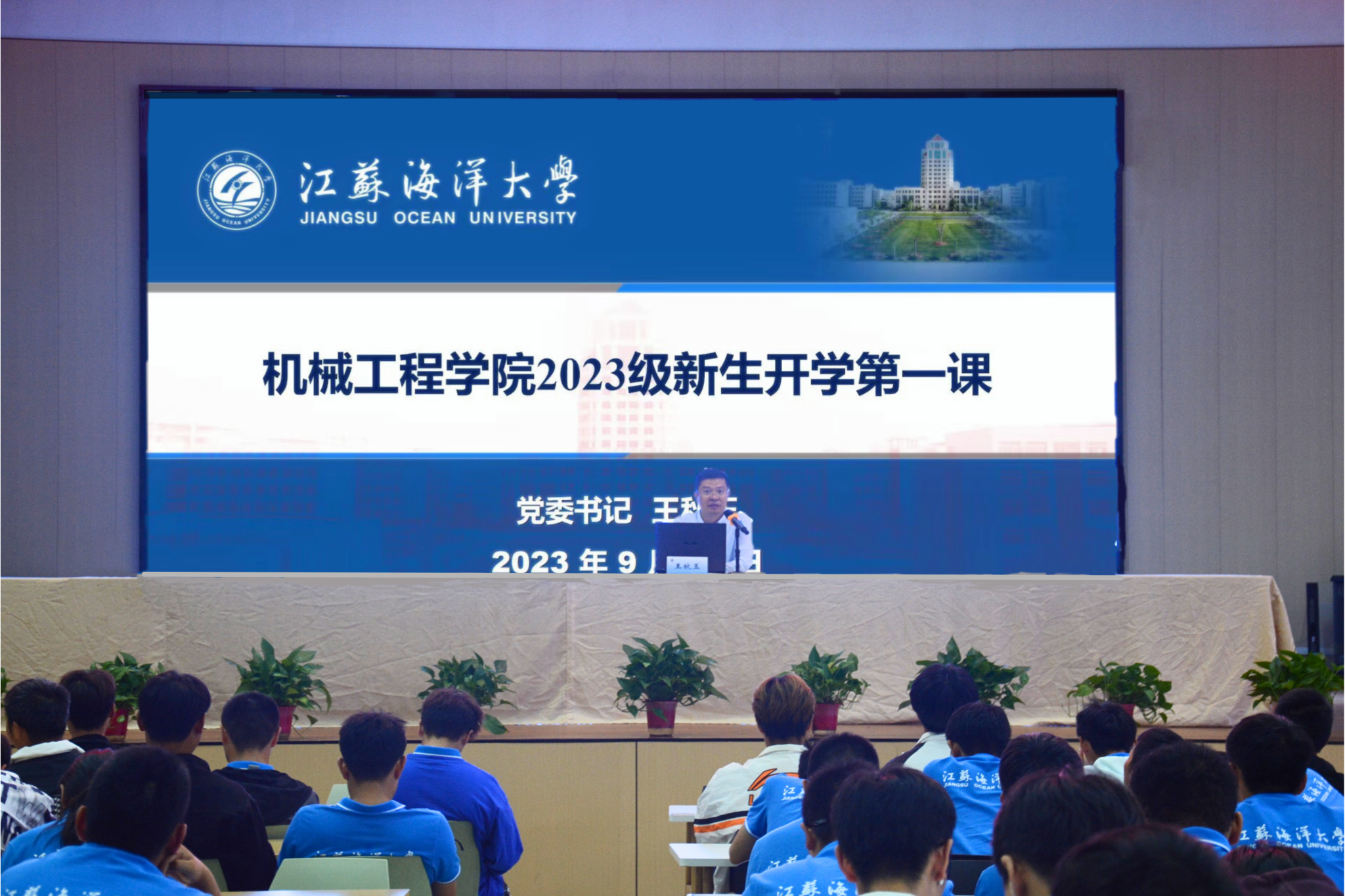 开学典礼结束后,王秋玉给全体新生讲授“开学第一课”。他详细讲述了学校和学院的办学历史、发展历程和未来愿景,并就如何更好地度过大学生活向同学们提出四点希望。一是树立目标,掌握好人生的未来航向;二是珍惜时间,利用好成长的关键时期;三是保持定力,完成好自己的学习任务;四是强身健体,保持好向上的身心状态。最后,他希望全体同学要牢记“毓德厚学匠心笃行”的院训,御风向海,行稳致远。