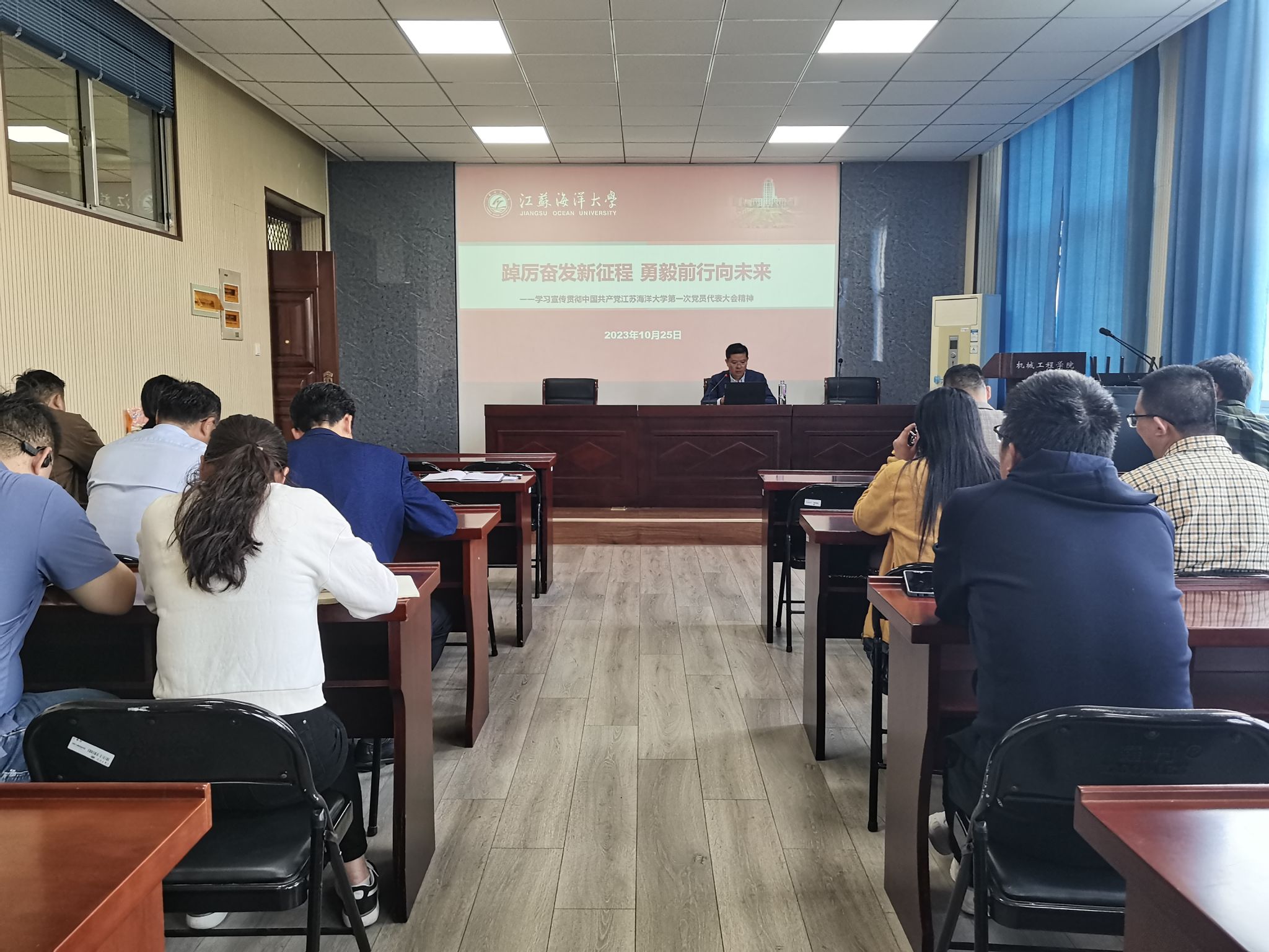 10月25日下午,机械工程学院党委召开全院传达学习贯彻江苏海洋大学第一次党代会精神大会。机械工程学院全体教职工参加,党委书记王秋玉主持会议并传达有关文件。
