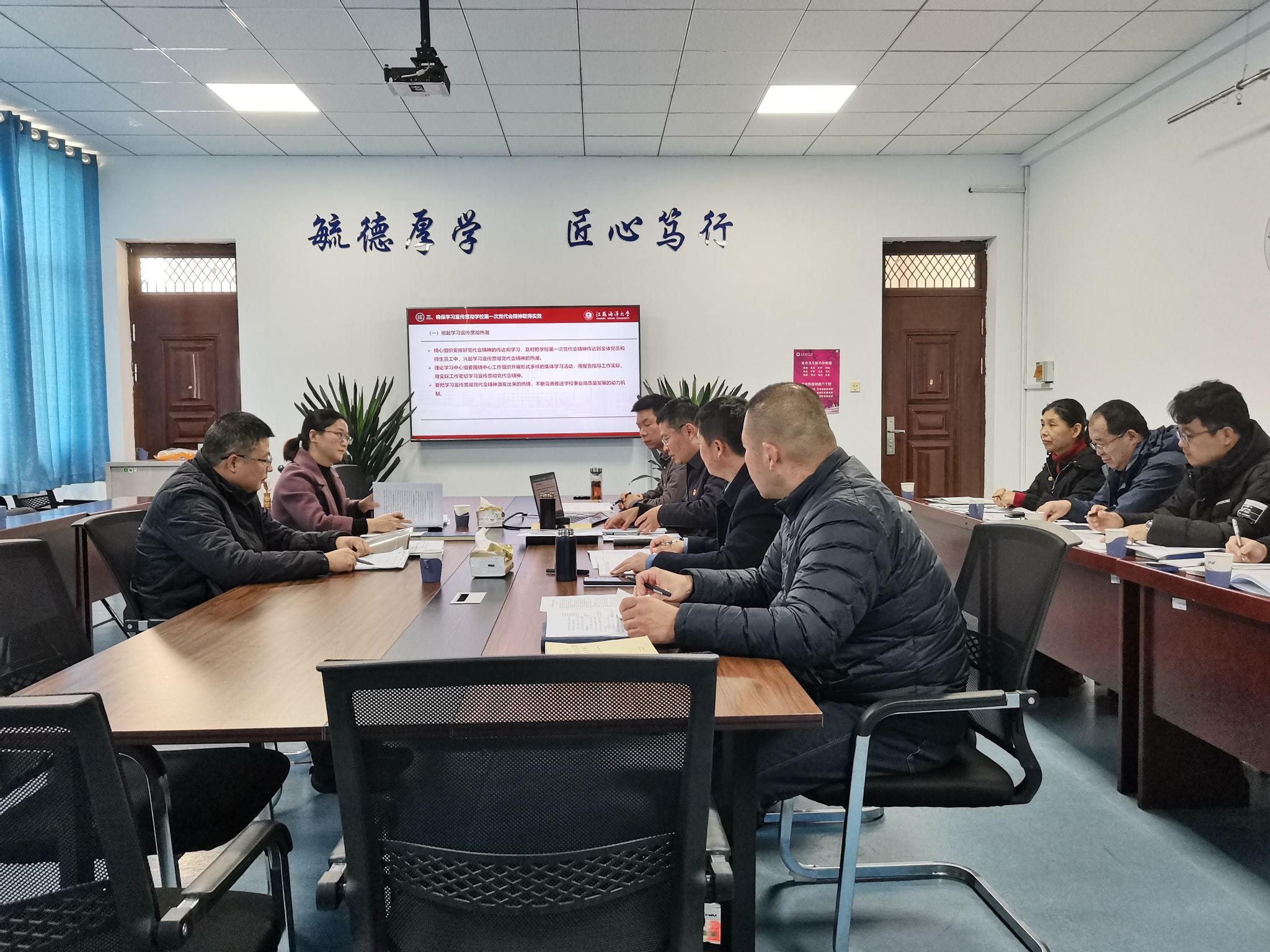 王秋玉采用PPT的形式宣讲学校第一次党代会精神。他表示,要对照党代会提出的工作目标和工作任务,紧扣学院具体实际情况,认真谋划工作推进思路,坚持围绕党建与事业发展“一融双高”这“一个中心”,聚焦博士学位授权点达标建设和国家级一流本科专业建设这“两项重点”,强化聚力内涵建设、聚力质量提升、聚力特色发展这“三个聚力”,扎实推进党建引领工程、学科攀登工程、教育创新工程、科研提质工程、英才聚集工程、强院筑基工程等“六大工程”,凝心聚力、真抓实干,努力将学校第一次党代会精神落地落细落实。