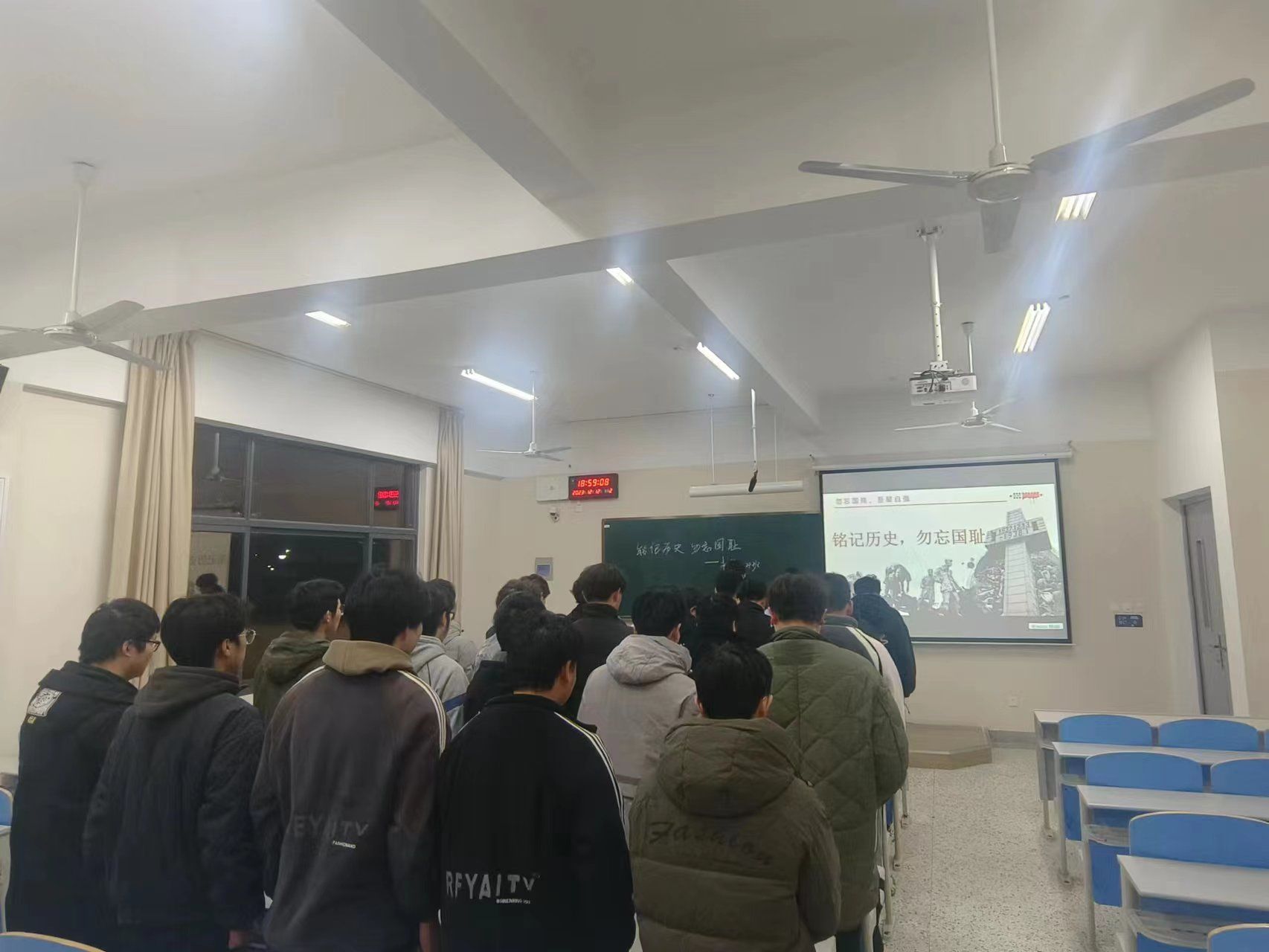 12月12日,机械1224班开展“铭记历史、勿忘国耻”主题团课。活动伊始,所有人起立默哀一分钟,缅怀南京大屠杀中的死难者同胞。主讲人主要从“国家为什么设立公祭日、设立公祭日的意义、设立公祭日产生的深远影响、南京大屠杀历史、勿忘国殇,铭记历史”五个方面向同学进行讲解。以此来激发青年学生的爱国热情,并呼吁他们刻苦学习,肩负起时代赋予青年学生的历史使命和社会责任。