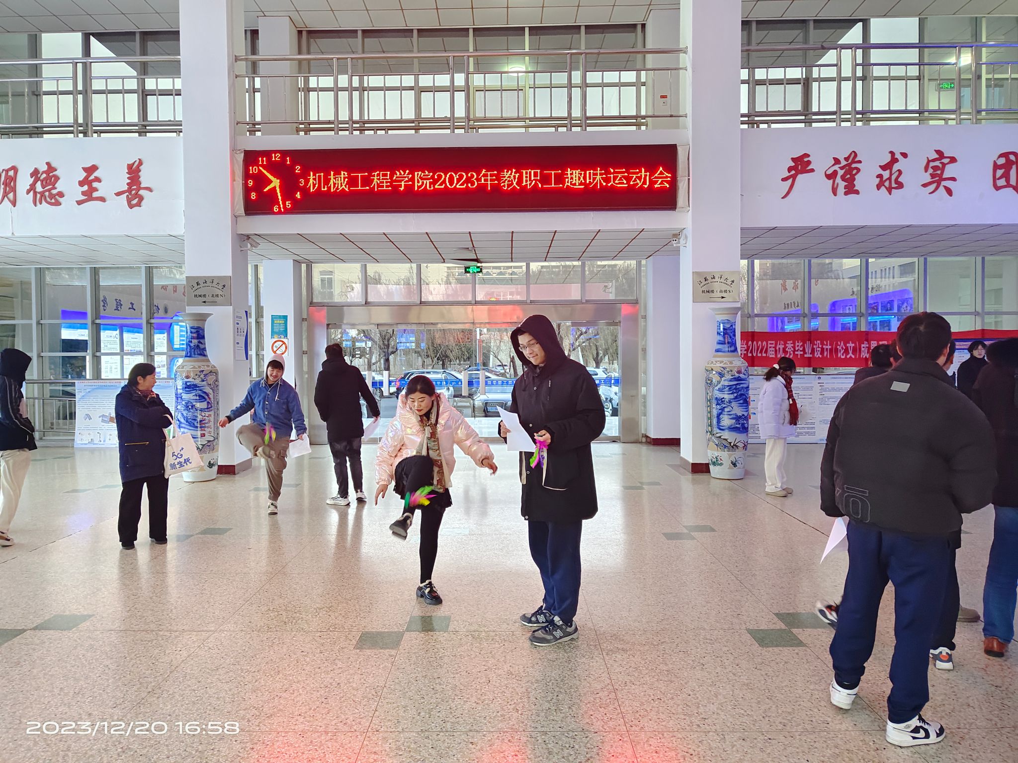 为增强身体素质,乐享健康生活,促进教职工之间的交流互动,营造积极向上、和谐奋进的文化氛围,12月20日下午4时,机械工程学院全体教职工齐聚机械楼大厅,参加我院教职工趣味运动会。本次活动共有三个趣味运动项目:足球射门、踢键子和单人跳绳。
