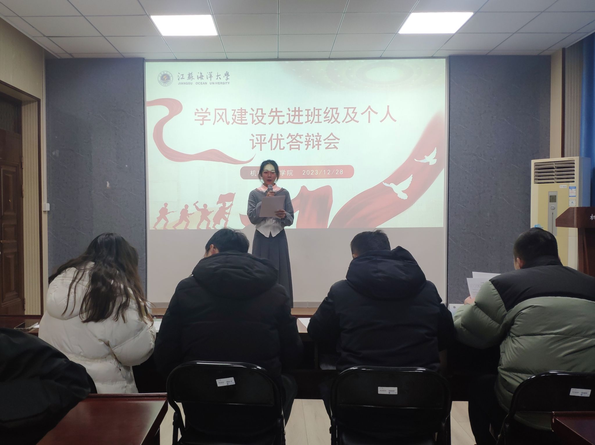 为表彰先进,树立典型,发挥先进班集体和个人的示范引领作用,切实推进学院学风建设工作,12月28日晚上,机械工程学院在机械楼N210召开2023年学风建设先进班级及个人评优答辩会。学院党委副书记高勇、全体辅导员参加本次会议并担任评委,学院各班级班长、团支书到场观摩。