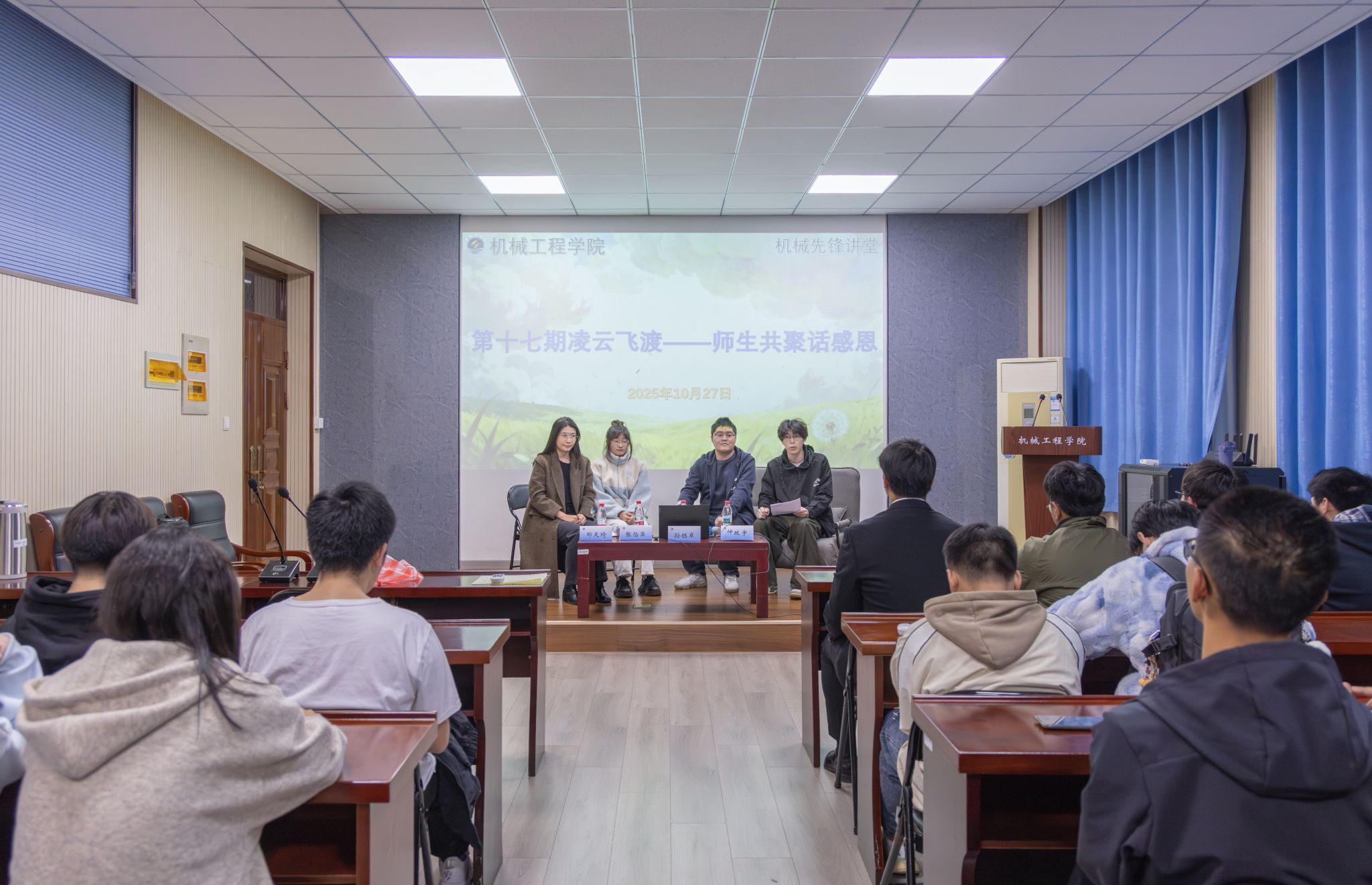10月27日晚,机械工程学院在机械楼N210举办第十七期“凌云飞渡”访谈活动暨机械先锋讲坛——师生共聚话感恩。辅导员邱天琦与仲政宇、张怡萍、孙钰卓三位同学担任主讲嘉宾,共话求学路上的感恩与奋进。