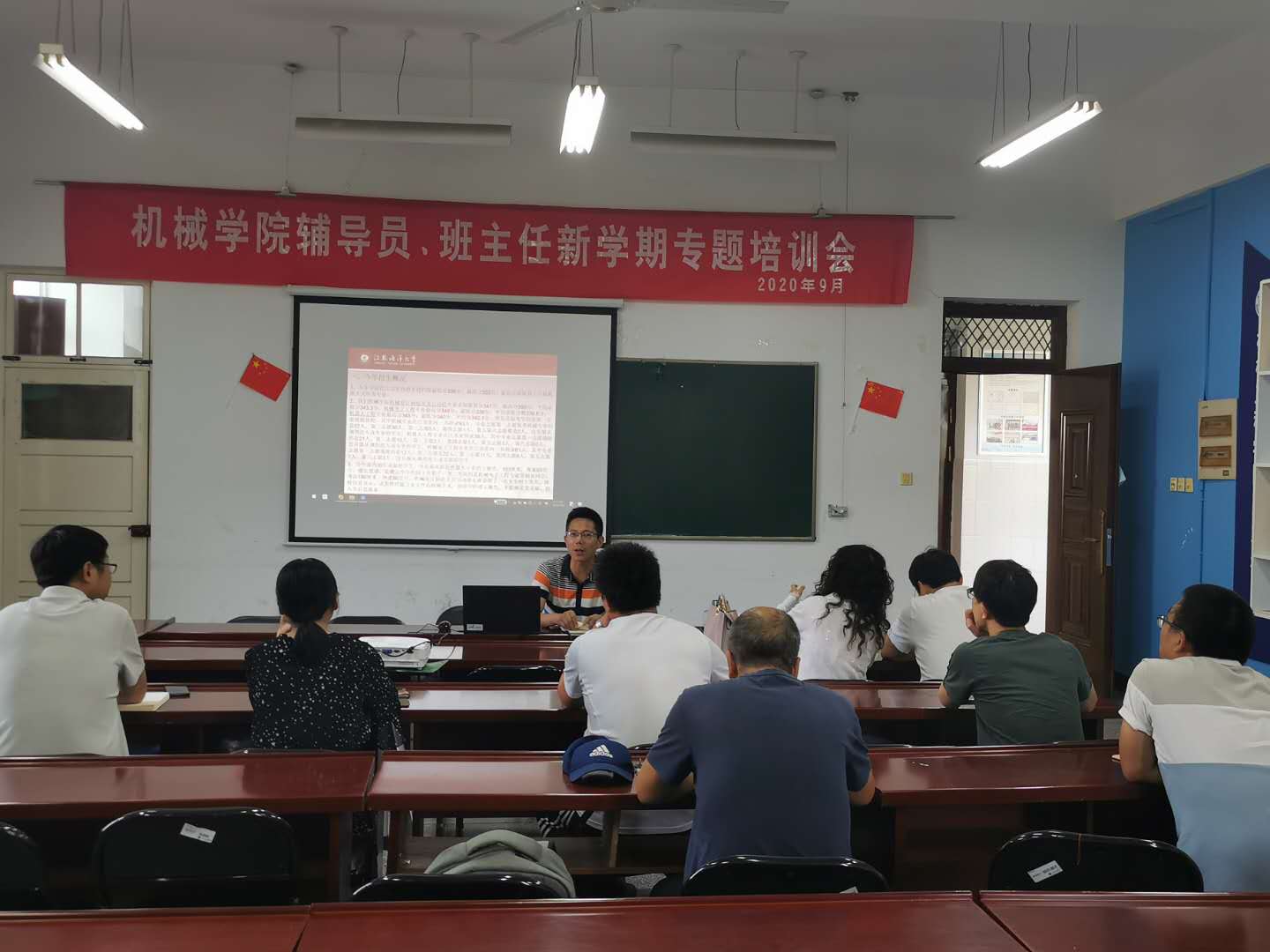 赵求勇先概述了校院学生工作组织机构和运行机制,用翔实的数据剖析了我院在招生和就业方面的优势,并对新学期班主任配备、辅导员分工情况进行了解读和说明。接着,他围绕“如何开展班级信仰公开课、如何加强班风和学风建设、如何加强心理健康和安全教育、如何做好后进学生转化、如何做好疫情防控、如何迎接创文工作“六个方面主题,结合自己20年的团学工作经历,用一件件生动的事例和一组组清晰的图表,给全体参会人员进行了一次系统的业务培训。