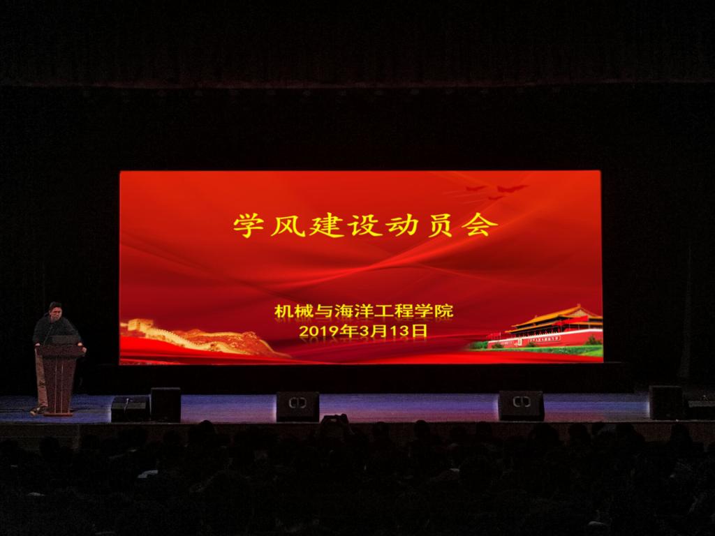为进一步贯彻新时代全国高等学校本科教育工作会议精神,坚持“以本为本”,推进回归学生要刻苦读书学习的常识,落实校第四次党代会关于全面提升人才培养质量的要求,3月13日晚7点半,机械与海洋工程学院在大礼堂召开学风建设动员大会。学生处副处长张志浩、院党委书记毛纪登、副书记赵求勇,全体辅导员及苍梧校区1300余名学生参加了大会。