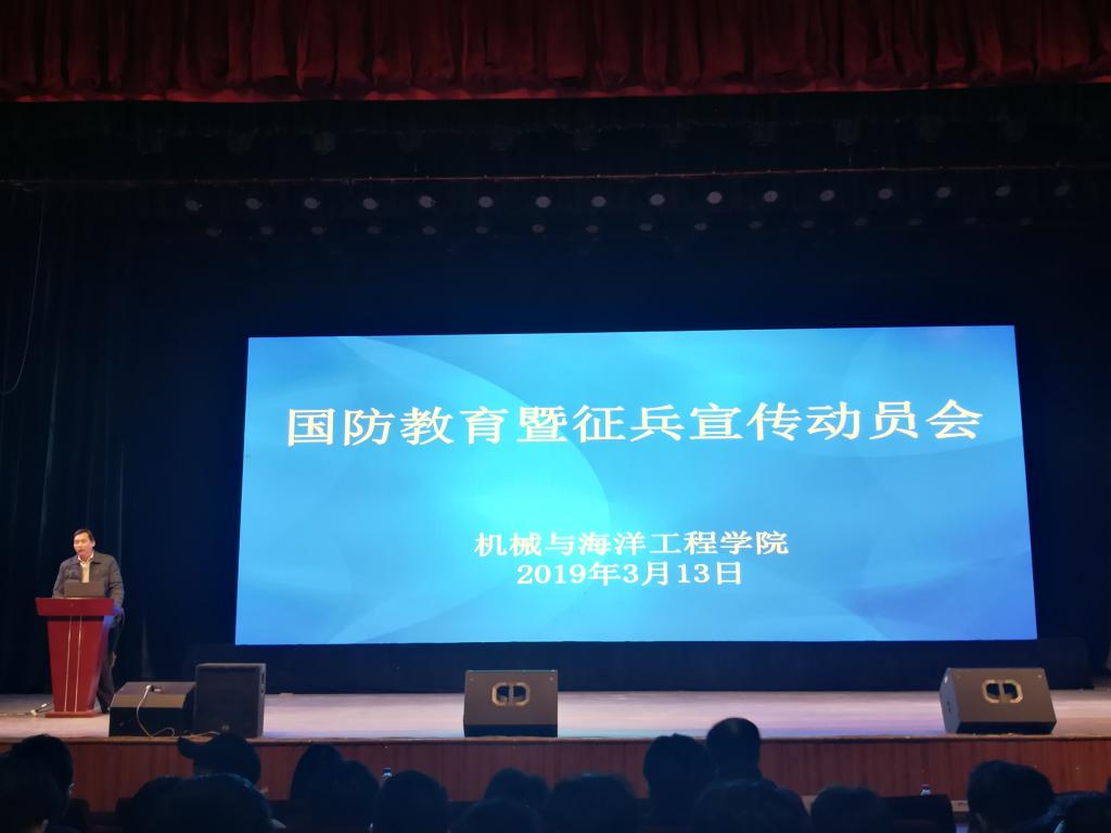 3月13日晚19时,机械学院国防教育暨征兵工作宣传动员会在学校大礼堂举行。校人武部副部长张志浩、院党委书记毛纪登、辅导员和全院学生参加了此次动员会。会议由院党委副书记赵求勇主持。
